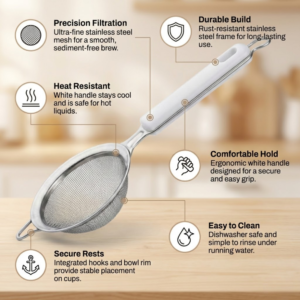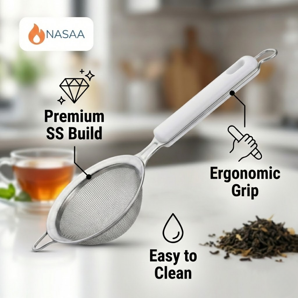 The SS Handle Tea Strainer is designed for efficient and hygienic straining of tea and hot beverages. Made entirely from high-quality stainless steel with a fine mesh filter, it ensures smooth tea without residue. Its sturdy handle provides a firm grip and long-lasting durability, making it ideal for daily use at home, cafés, and restaurants.