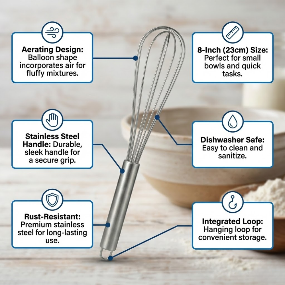 Its compact 8-inch size provides excellent control and comfort, making it perfect for small bowls, pans, and daily kitchen needs. The sturdy stainless steel handle ensures a firm grip and safe handling during use. Easy to clean and highly hygienic, this whisker is suitable for home kitchens, bakeries, cafés, and professional food preparation environments.