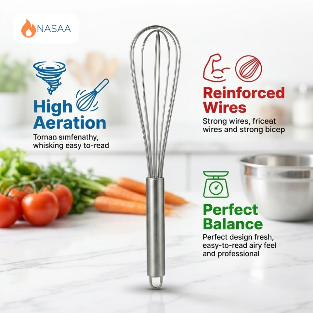 The Stainless Steel Whisker – 8 Inch (23 cm) is an essential utensil for precise and effortless mixing. Crafted from premium-grade stainless steel, it is resistant to rust, corrosion, and bending, ensuring long-lasting performance even with regular use. The well-spaced wire loops allow proper air incorporation, helping achieve smooth batters, fluffy eggs, and lump-free sauces.