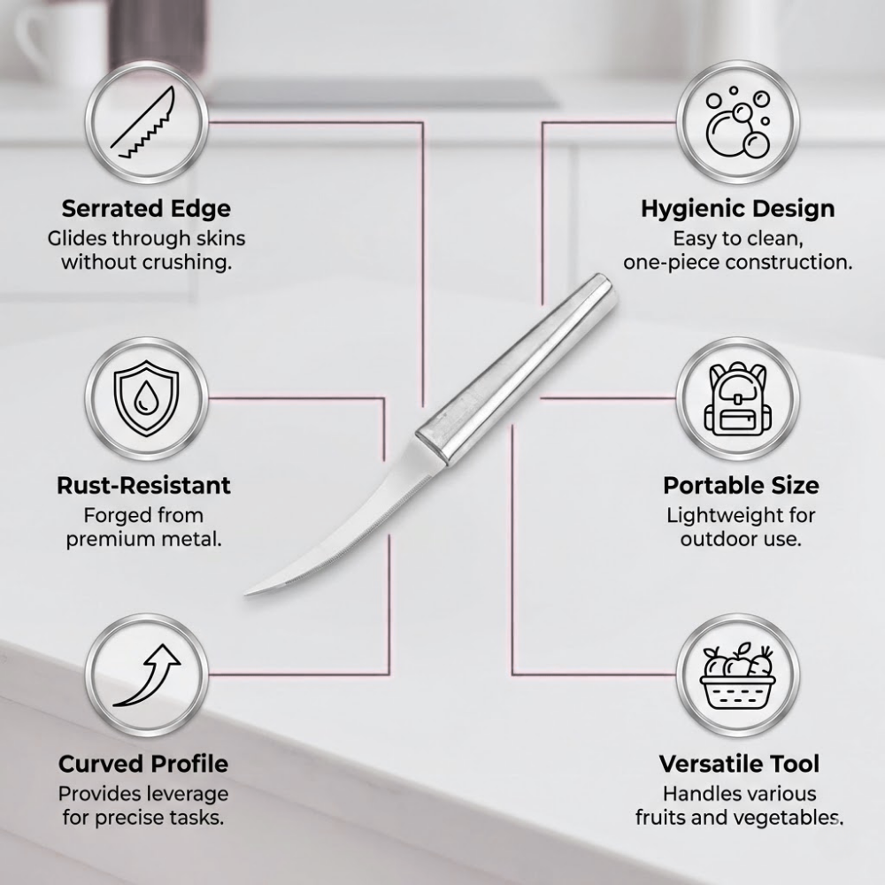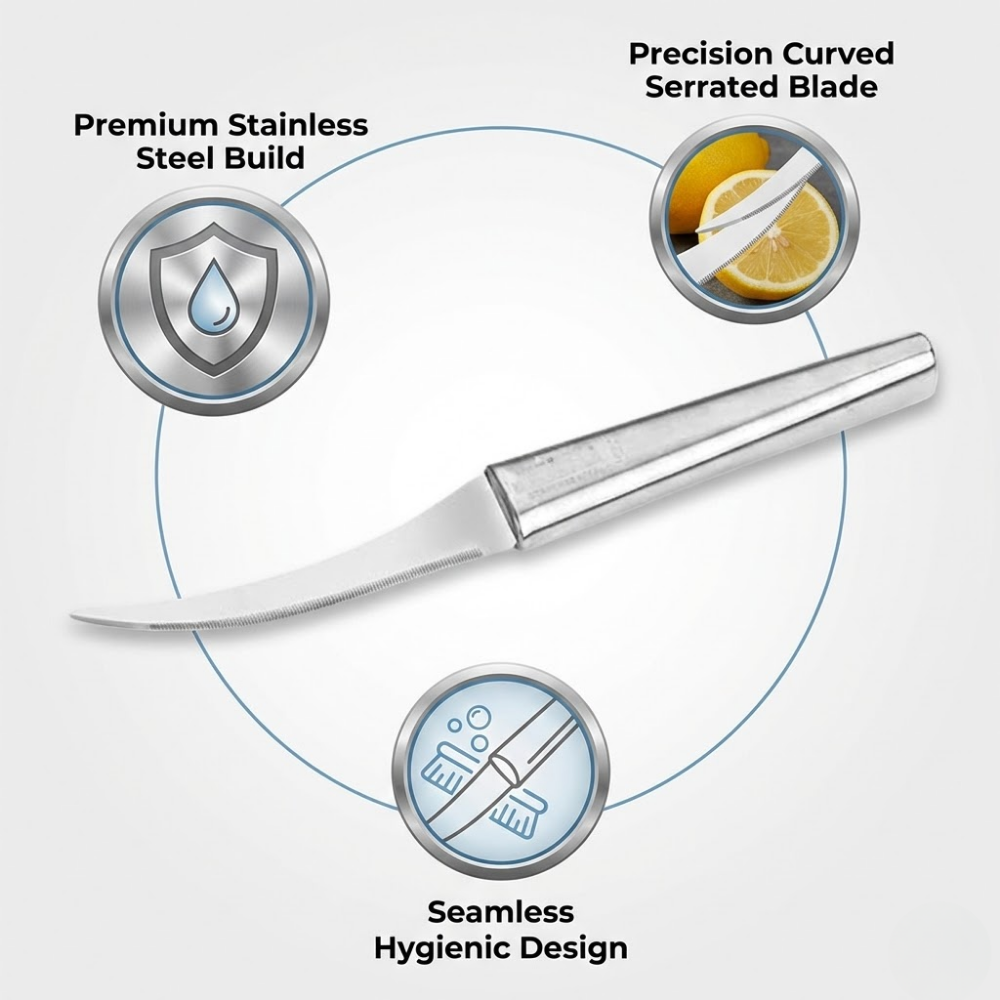 The curved blade shape ensures better control and cleaner cuts, making it perfect for tomatoes, citrus fruits, bread rolls, and other soft-skinned produce. The stainless steel handle offers a comfortable grip and balanced handling, reducing effort and improving accuracy during use.