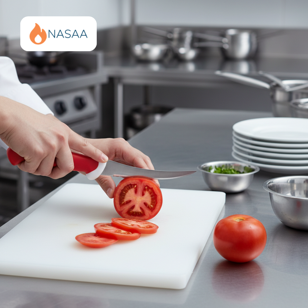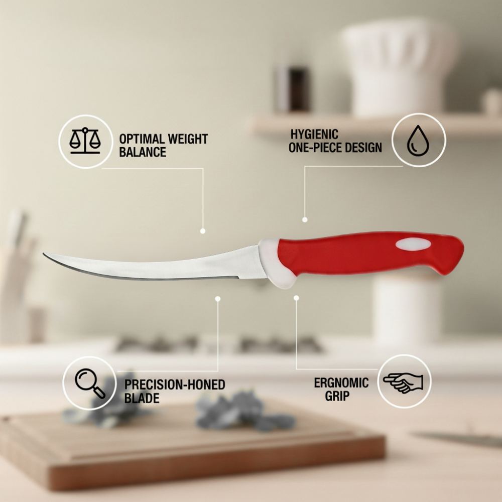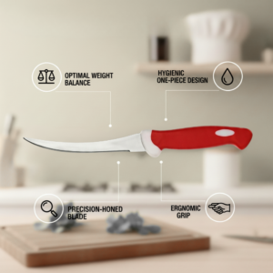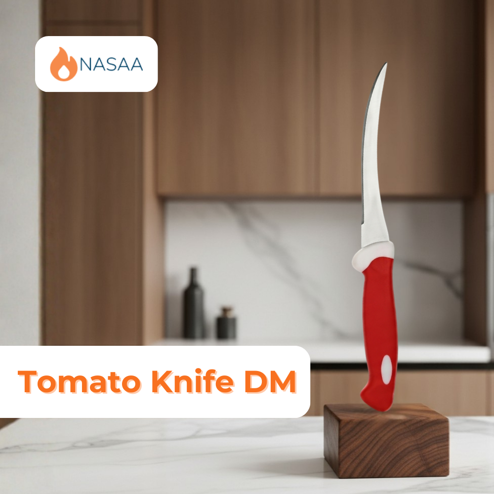 The Tomato Knife DM is specially designed for clean, precise slicing of tomatoes and other soft-skinned foods. Featuring a sharp serrated stainless steel blade and a durable ergonomic DM handle, this knife cuts smoothly through delicate skins without crushing the interior. Ideal for home kitchens, restaurants, and professional food preparation environments.